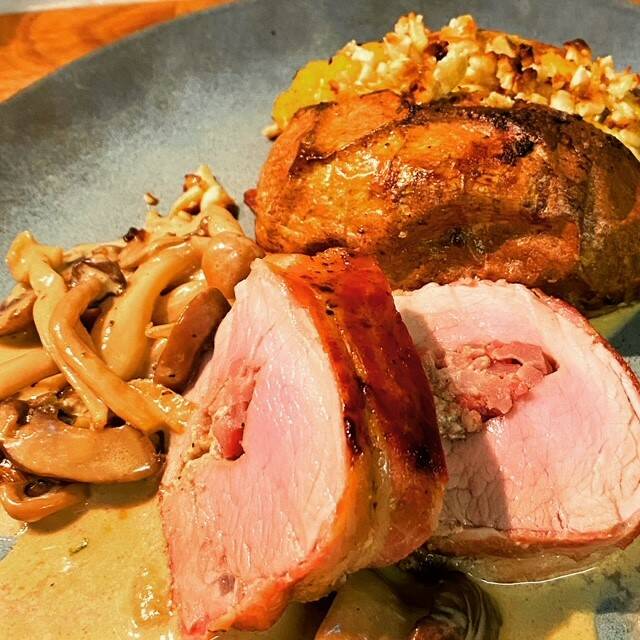 Varkenshaasje met spek en zoete aardappel met feta