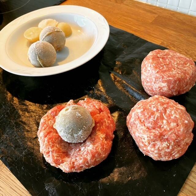 voeg de kaas en een eierdooier toe aan het gehakt en meng dit goed onder elkaar.