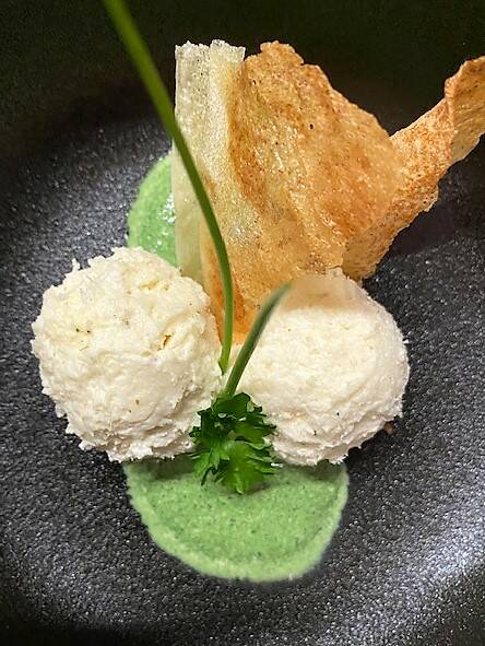Mousse van kabeljauw - rucola spinazie creme en krokantje met wasabi